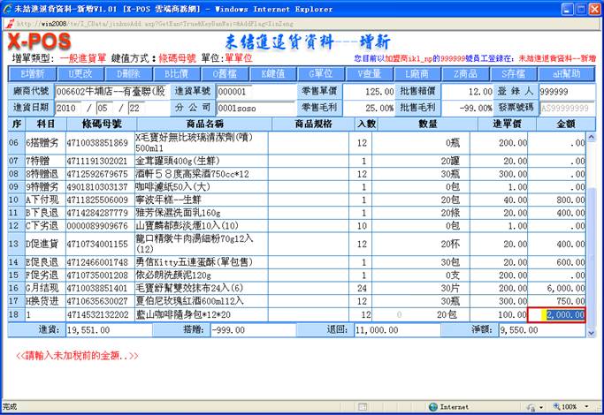 18-J>發票明細:有指定發票號碼之進貨單,將會將進貨金額轉入發票明細檔中。但是執行本項財稅同步功能時,一定需要進貨金額與發票上的金額完全吻合。