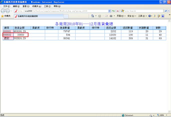 廠商月份進貨彙總,未增加進貨單前,進貨金額為:33650;增加進貨單之後,進貨金額為:33650+300=33950