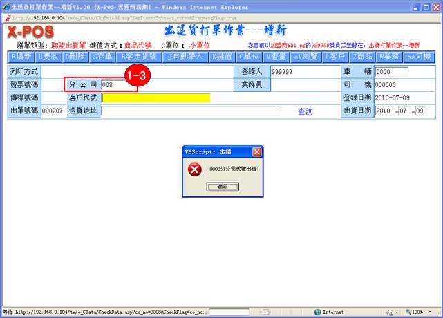 1-3. 如輸入分公司代號:008, 不存在,則彈出提示框,單擊