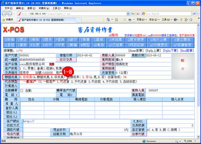 )鍵進入客戶資料作業,客戶代號為:000001是非聯盟成員,如圖: