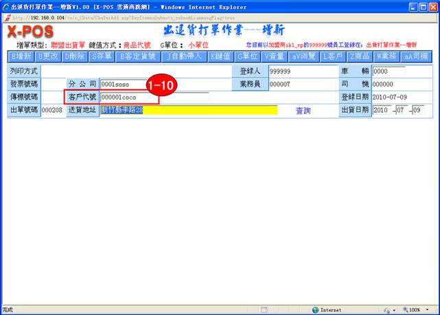 1-11 .送貨地址:當您輸入客戶代號時,送貨地址會自動顯示: