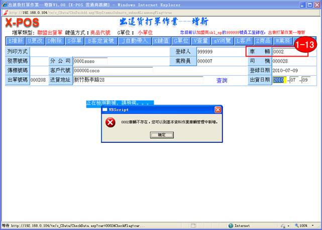 1-13. 車輛:若输入0002,不存在此車輛,提示:
