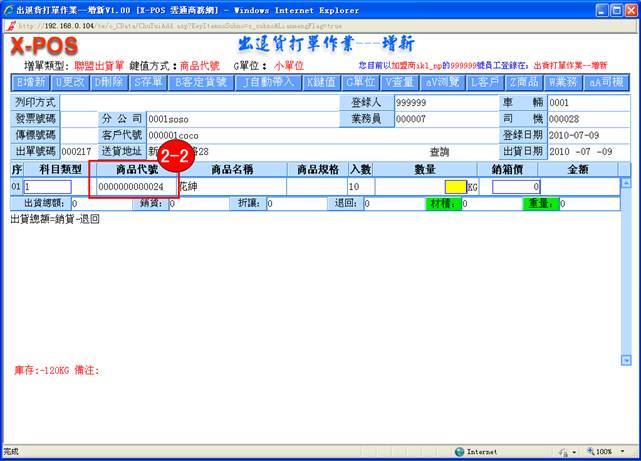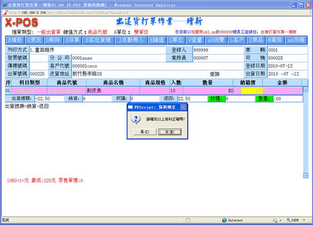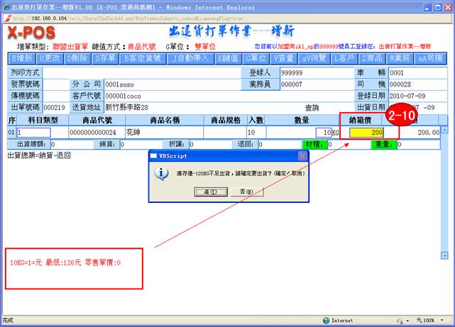 2-8. 銷箱價:填入你所要出貨的商品的相關資料,當你所輸入的批價小於最底價時,系統將會自動彈出警告窗口,點