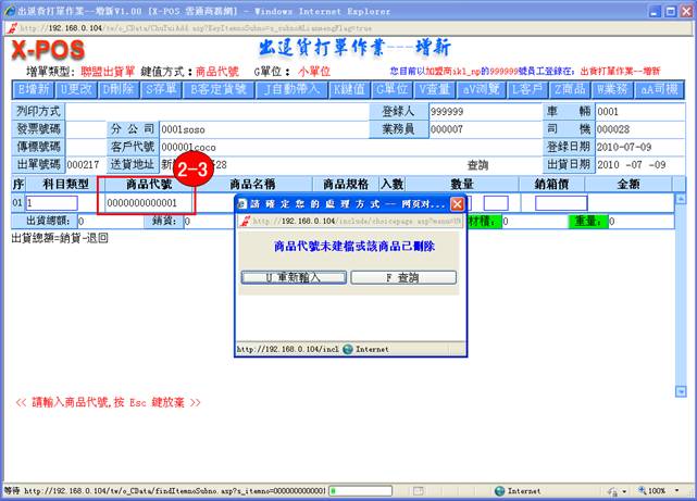 2-3. 輸入值不符合各條件,即庫中不存該商品代號時,將彈出提示,如輸入0000000000001後按