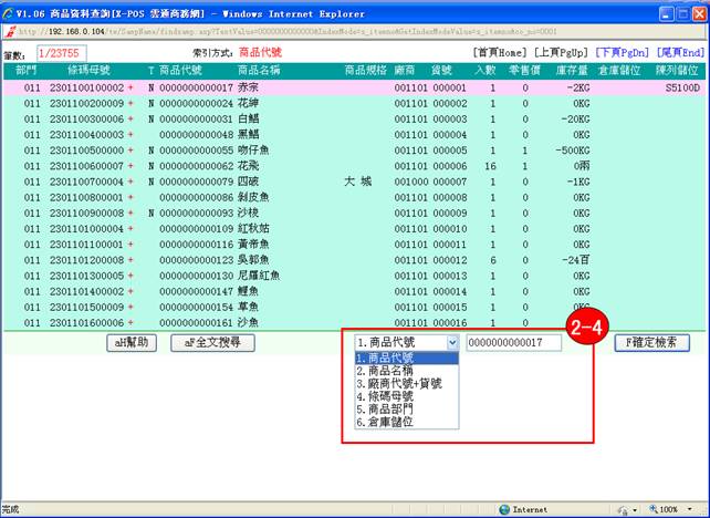 )功能,以商品代號顯示,在左上角會顯示鍵值方式:商品代號,如圖: