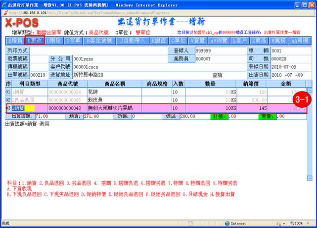 3-1. 若有些出退貨單資料有錯或不妥,可以進行修改。首先選擇您需要修改的記錄,單擊