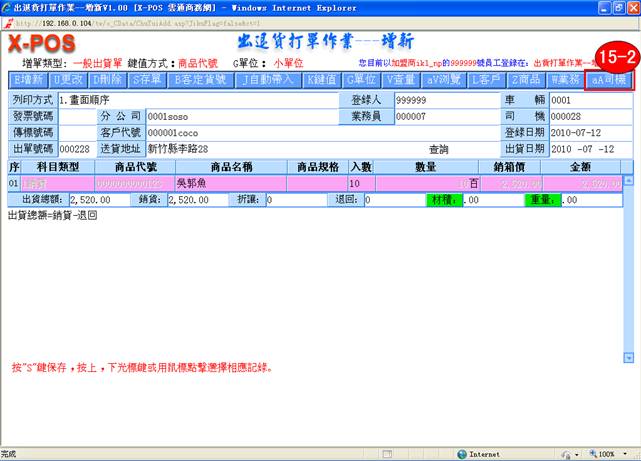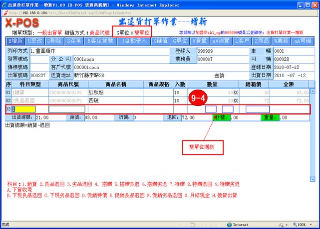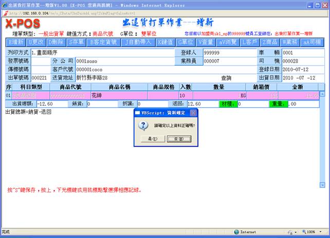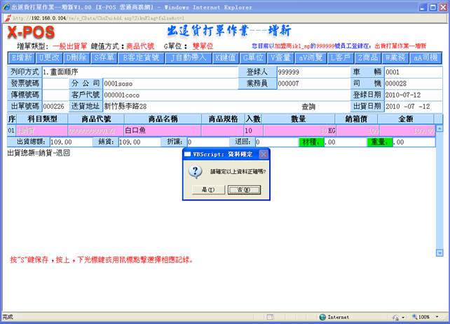 鍵,確定出貨;光標將會自動定位到下一筆的科目類型框中,如需增新出貨商品可繼續填放相關的資料,如不需增新可按