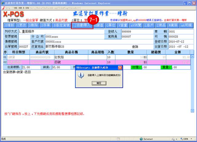 7-1.當啟動帶入功能後.輸入的科目將會自動帶往下一個增新時參考使用,這樣可以方便操作者連續輸入相同出貨科目時減少再次作科選擇動作,對於天天需要大量輸入出貨單的使用者相當實用。點擊