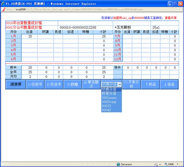系統允許快速查看該出貨商品的相關銷售數量表內容,如此可以供操作者快速判斷出貨商品的週期性問題,或是銷售數量的多寡,來與出貨數量的多少做個人工的相對比較,以防出貨數量的偏高造成無謂的庫存積壓。數量的查看可以快速看到歷年的銷售數量,像是月量、季量、半年量、年量。