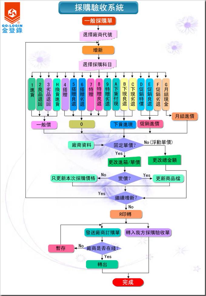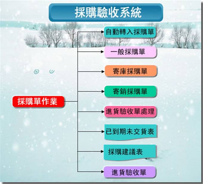 包括自動轉入採購單、一般採購單、寄庫採購單、寄銷採購單、採購單驗收處理、已到期未交貨表和採購建議表、條碼掃描採購單8項作業。流程圖如下: