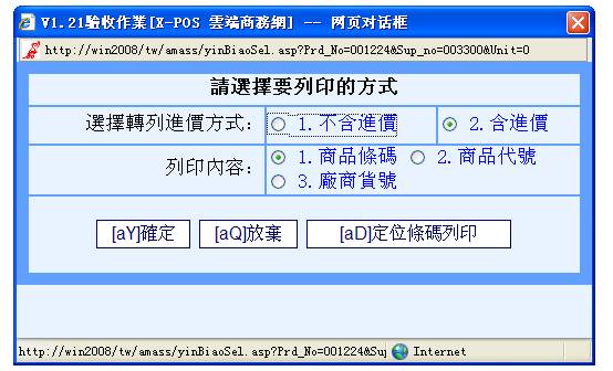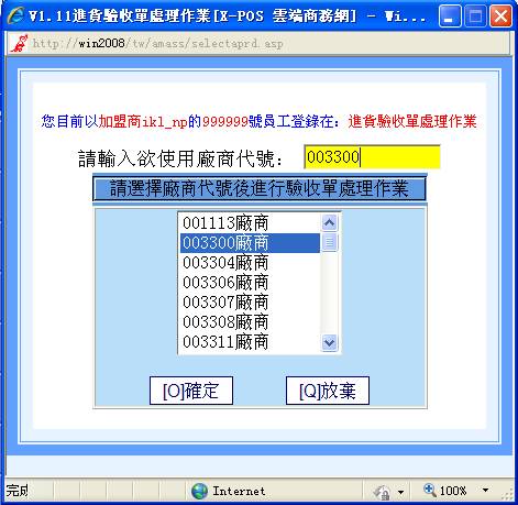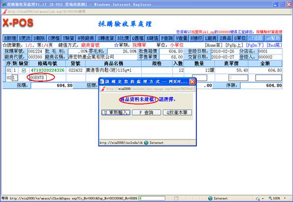 3-5.系統會去找出該商品母號相同條碼的所有商品出來,再去比對其中是不是有本[廠商代號]的商品存在,存在的話就直接抓取該商品資料的相關內容轉入進貨作業中繼續操作;但是萬一一樣的條碼商品又建立有指定的廠商代號商品,可是該廠商代號的商品可能有一個以上時,系統並不會要求操作者選擇使用哪一個廠商貨號的商品,只是給於第一個找到的廠商代號的商品繼續操作,因此有同樣的條碼商品又同一個廠商代號,但是必須建立二個不同廠商貨號的商品資料這樣的情況,那進貨作業時就應該切換利用