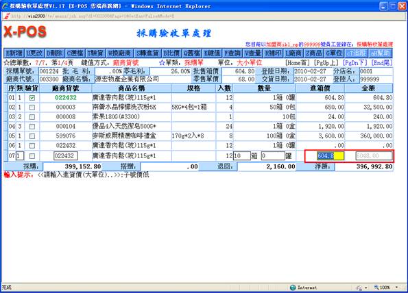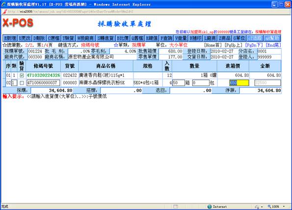 ),表示這次的進價就以輸入時的價格格為準,原來的商品紀錄並不更動,因此下次進貨時又回復參考商品資料中所設定的進貨價格。變動價格紀錄時將以進貨當時的指定分公司來異動,若是由於進貨金額有大量變動而必須更改銷售價格,一定要記得馬上去商品資料中更正相關售價(這是因為考慮到若是正在進貨的廠商商品並非母號商品,要更改相關售價一定要進入母號商品才得以更正的緣故)。輸入進貨科目為1.進貨;2.良品退回;3.劣品退;4.搭贈;