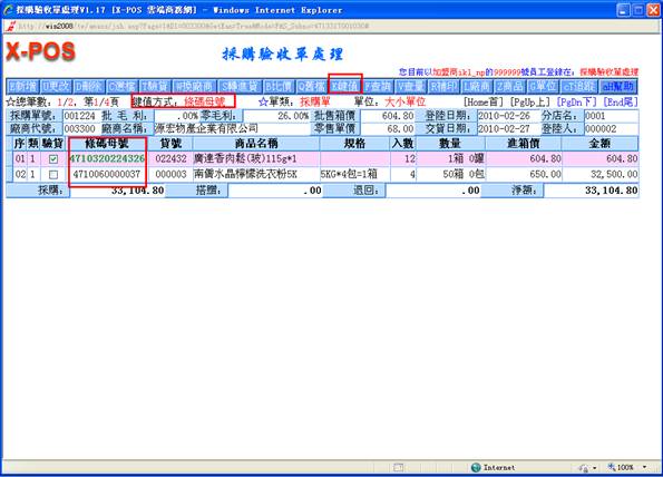 12-4. 當採用國際條碼(條碼母號)輸入的方式時,系統會在輸入的國際條碼(條碼母號)中找出是否存在有目前指定廠商的供貨廠商代號資料,若是不存在就是表示該國際條碼(條碼母號)沒有建立該廠商的供貨資料存在,若是存在時通常一個國際條碼(條碼母號)中,該廠商只能有一筆供貨商品資料的,若是有同條碼母號,卻建立有二個同廠商代號但是不同廠商貨號的資料時,系統永遠只能抓取第一個優先找到的供貨商品資料內容。