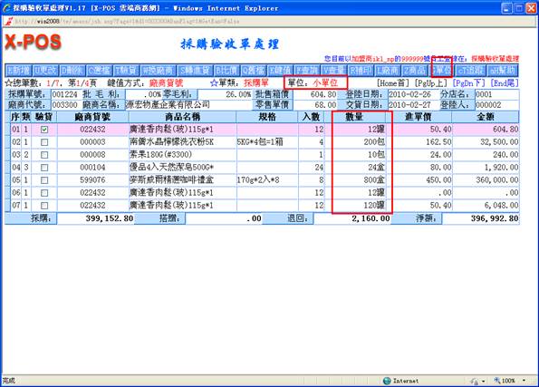 )快速切換鍵,來切換只顯示小單位的總數量,或是顯示大小單位自動換算的雙單位元顯示模式,二種模式可以適合各式不同顯示需求習慣的企業使用,雙單位例如:一箱為24罐輸入10箱5罐、一打為12雙輸入4打6雙、一斤為16兩輸入7斤8兩等等;只輸入小單位例如:120罐,6雙,10兩等等;輸入進退貨數量,按鍵盤上的