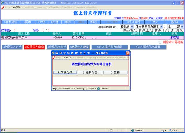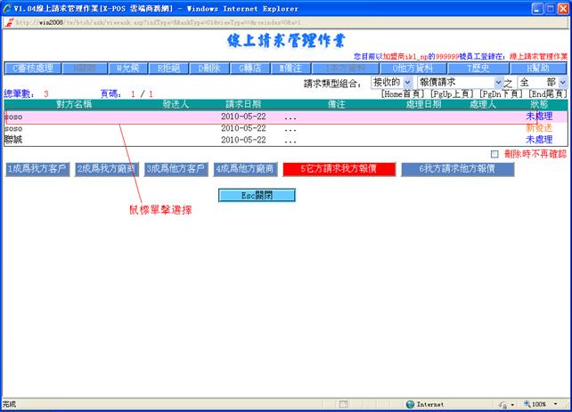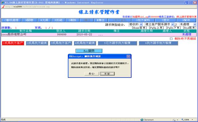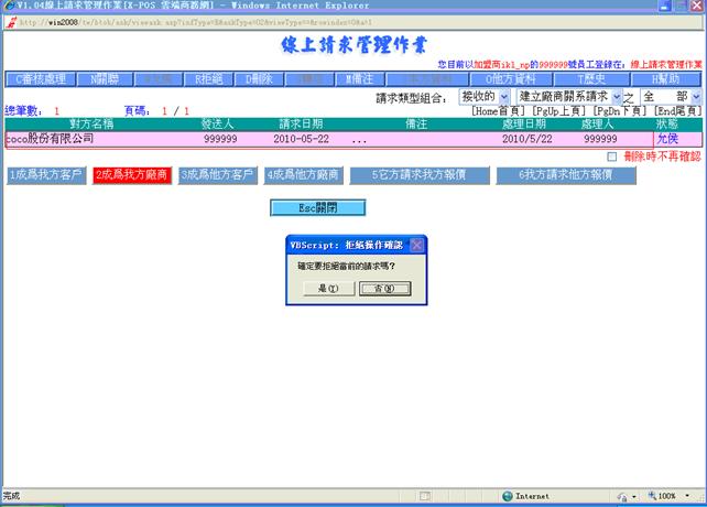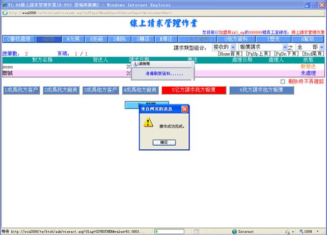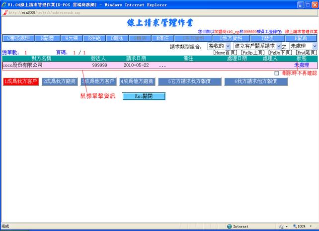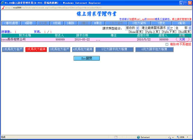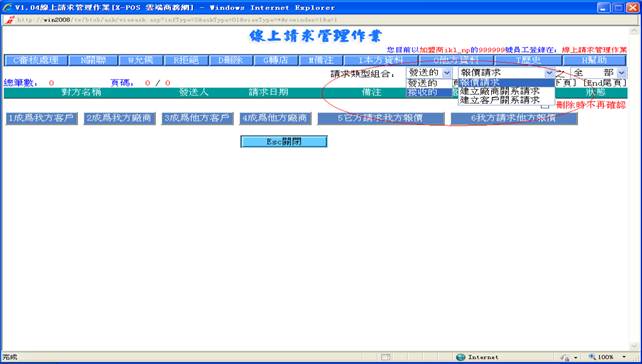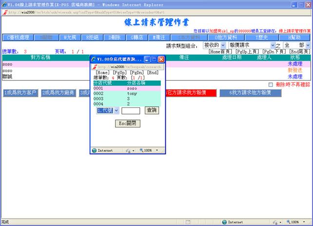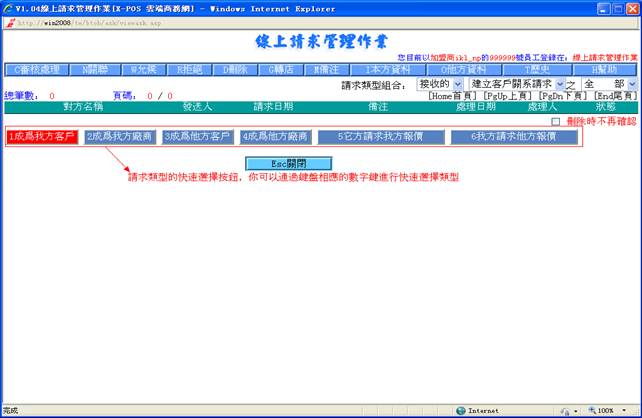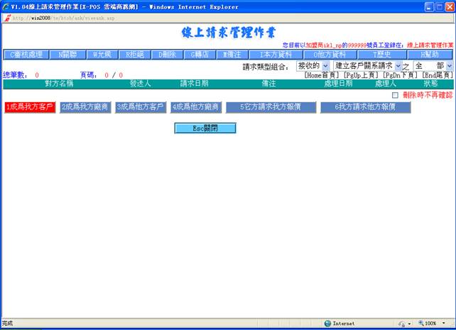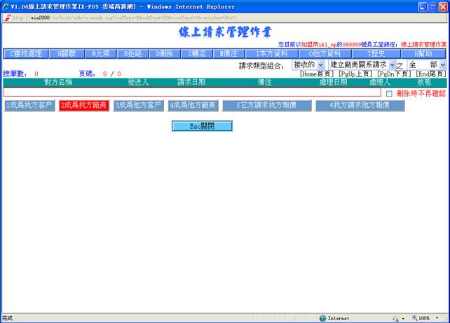 線上請求管理作業對請求的管理,目前包括建立客戶關系請求,建立廠商關系請求,商品報價請求,是由用戶/廠商在入門商店或加盟商主頁處發出。建立關系請求是客戶資料檔及廠商資料檔的來源之一。
