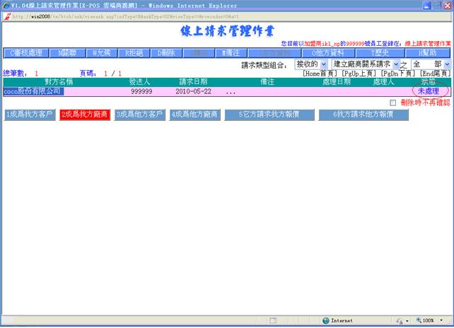 要新關聯廠商(客戶)或修正舊的資料關聯,只要已經加盟X-POS的廠商(客戶)給您發一個對應的請求消息(通過入門商店或您的主頁服務發送),您接收後在[線上請求管理作業]中進行關聯操作就可以了。