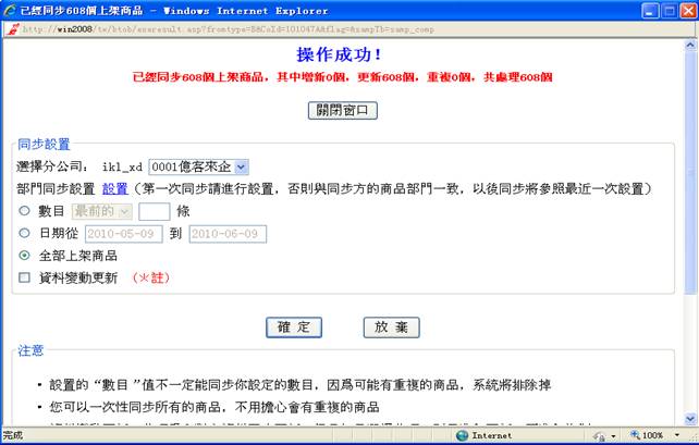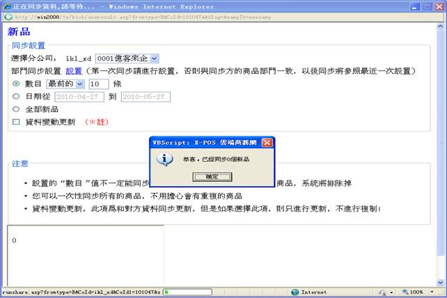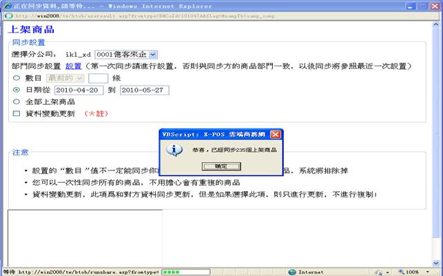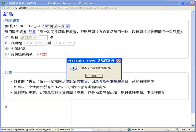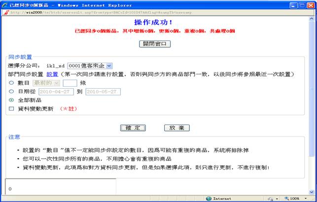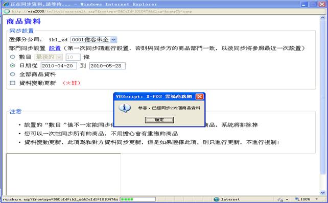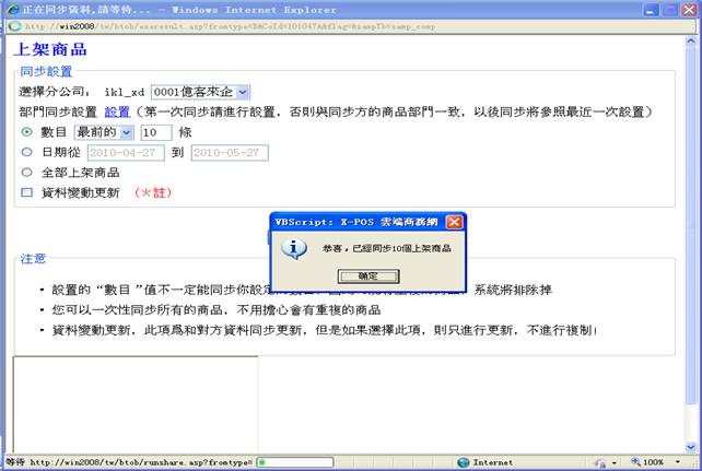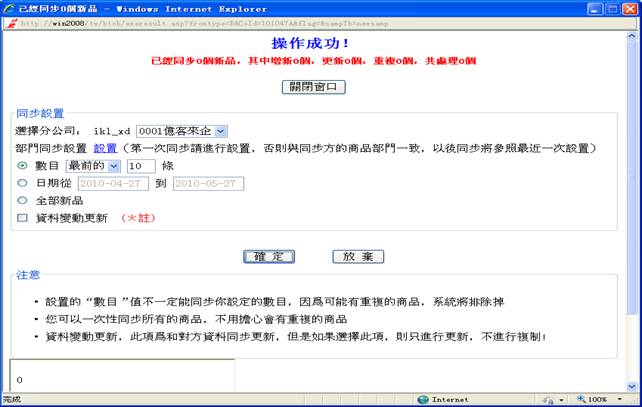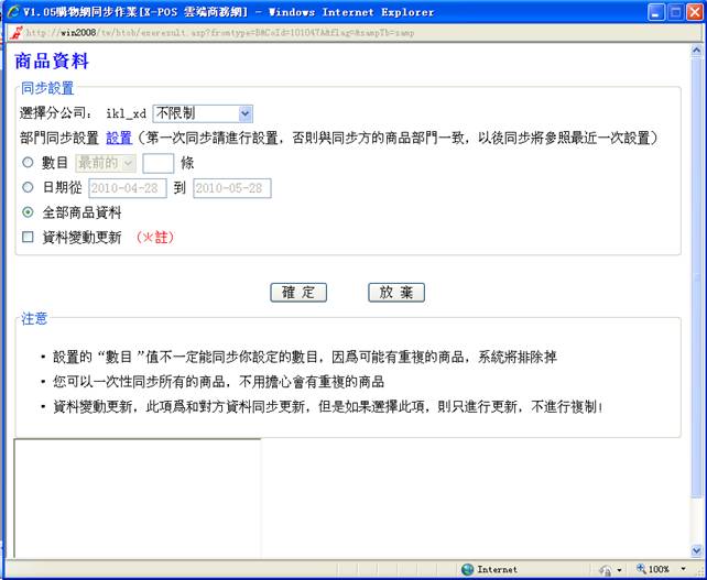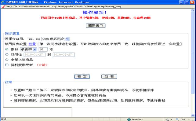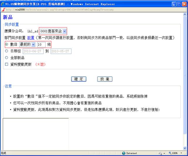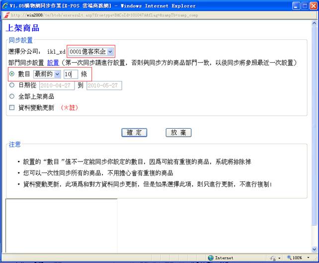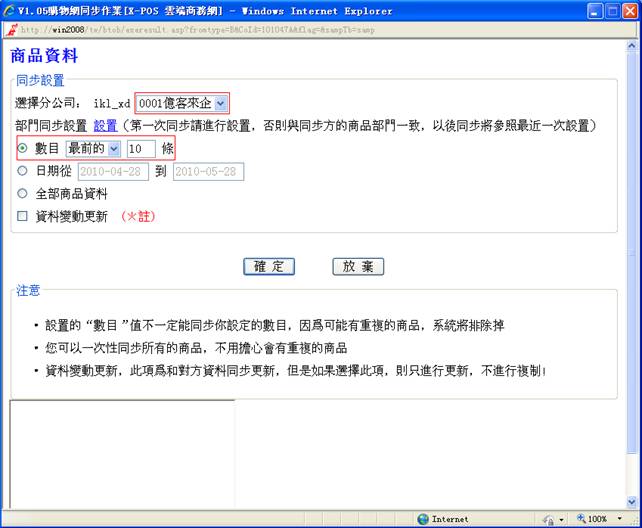 上圖,選擇分公司:您可以選擇ikl_xd旗下的一所分公司;部門同步設置:數目,您可以選擇同步最前的或最後的商品,再輸入同步指定商品的條數;日期,您可以選擇同步某段日期期間內的商品;全部商品資料,同步所有商品資料。(更多信息看頁面的注意事項)