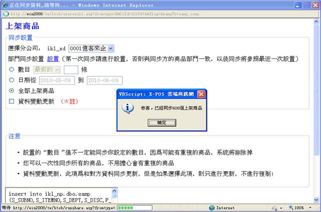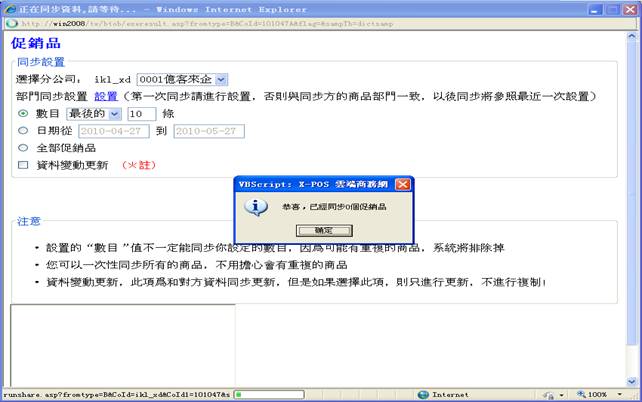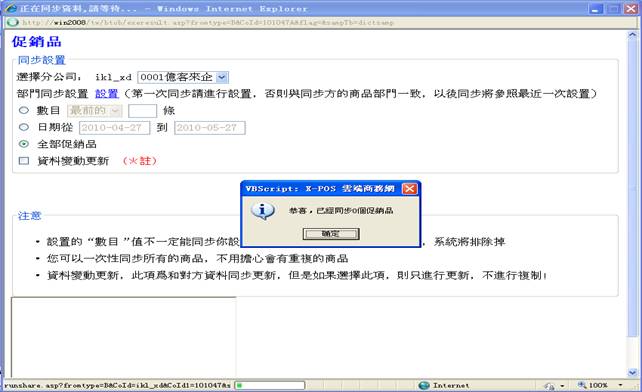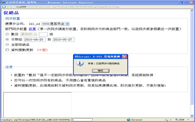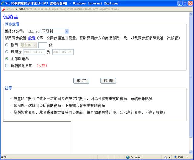 上圖,選擇分公司:您可以選擇ikl_xd旗下的一所分公司;部門同步設置:數目,您可以選擇同步最前的或最後的商品,再輸入同步指定商品的條數;日期,您可以選擇同步某段日期期間內的商品;全部促銷商品,同步所有促銷商品。(更多信息看頁面的注意事項)