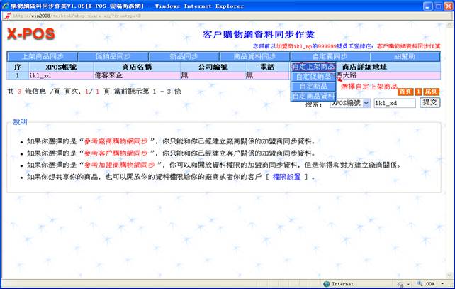 在左上角选择‘接受B2B商店’,再选择查询条件的类型,有“X-POS用户、商店、供應、商品、新品、促銷品、條碼、行業、電話、傳真、負責任、地址、郵編、聯盟”,然後輸入關鍵字,點擊搜索。在下面的商店列表中找到你想建立關係的商店。如下圖: