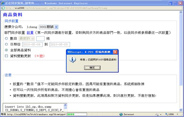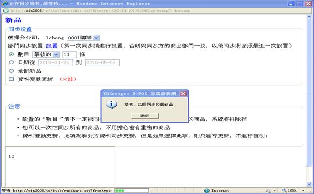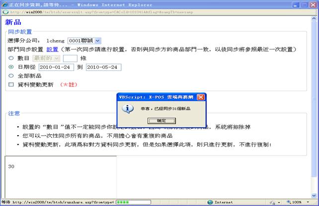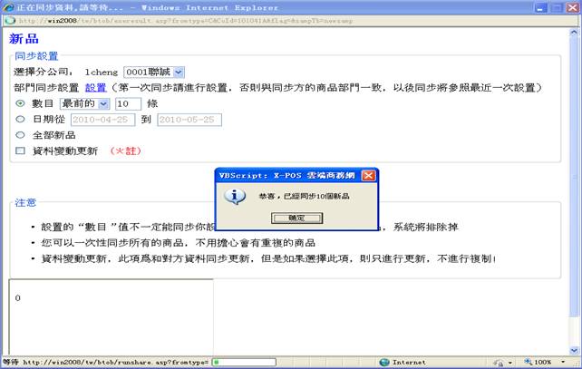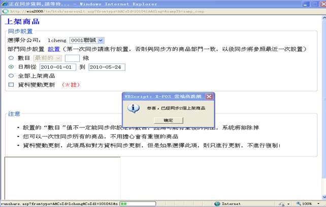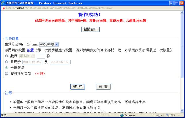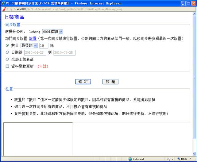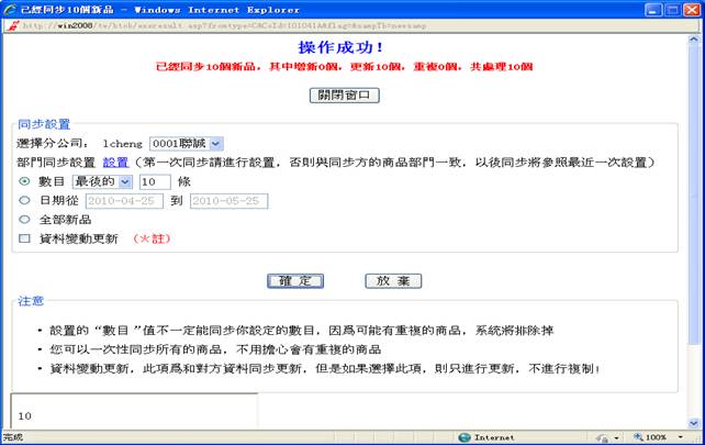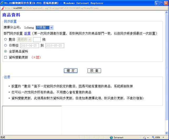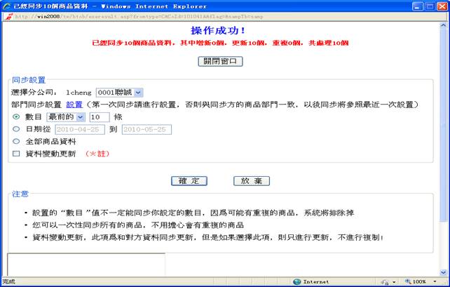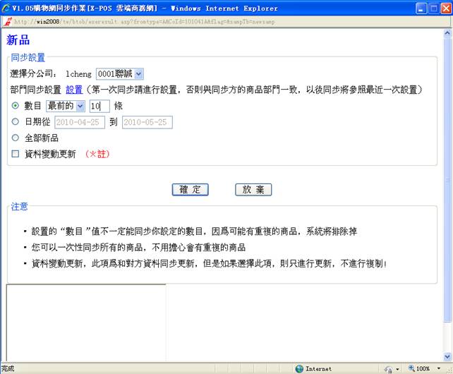 上圖,選擇分公司:您可以選擇lcheng旗下的一所分公司;部門同步設置:數目,您可以選擇同步最前的或最後的商品,再輸入同步指定商品的條數;日期,您可以選擇同步某段日期期間內的商品;全部商品資料,同步所有商品資料。(更多信息看頁面的注意事項)