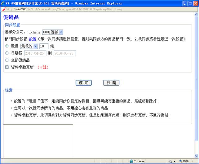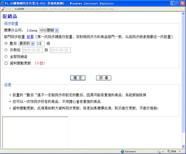 上圖,選擇分公司:您可以選擇lcheng旗下的一所分公司;部門同步設置:數目,您可以選擇同步最前的或最後的商品,再輸入同步指定商品的條數;日期,您可以選擇同步某段日期期間內的商品;全部促銷品,同步所有促銷商品。(更多信息看頁面的注意事項)