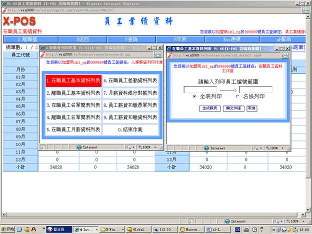 7-1-2. 輸入員工編號範圍=》選擇列印方式(1.全表列印)=》再選擇