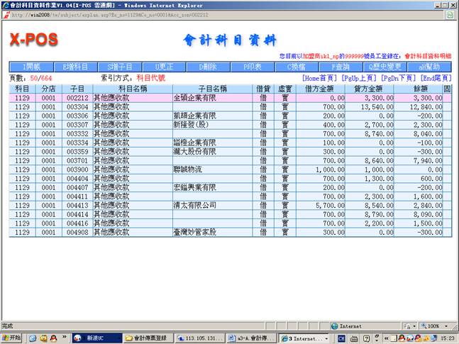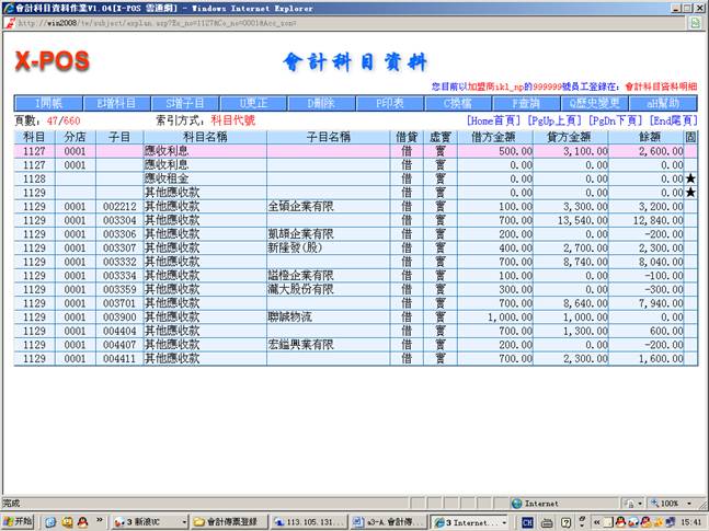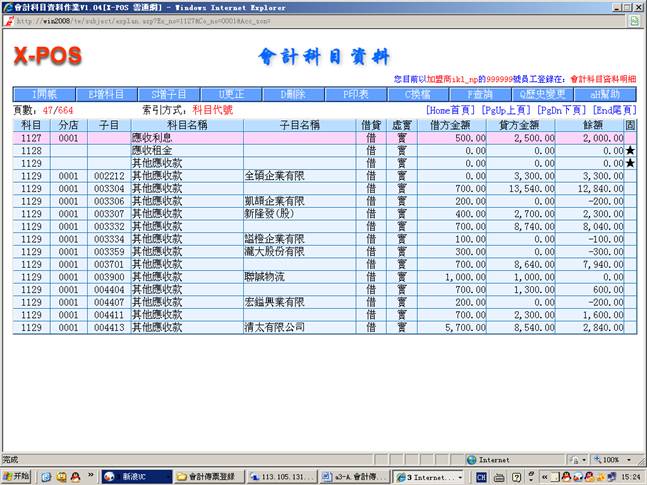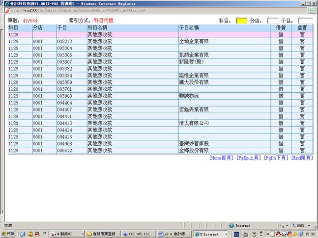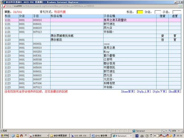 3-1.進入會計科目資料查找科目1121(分店0001和子目000010)、科目1129(分店0001和子目002212)和科目1127(分店0001)