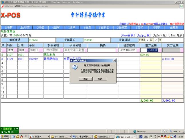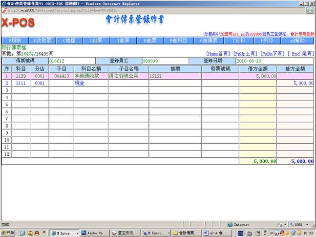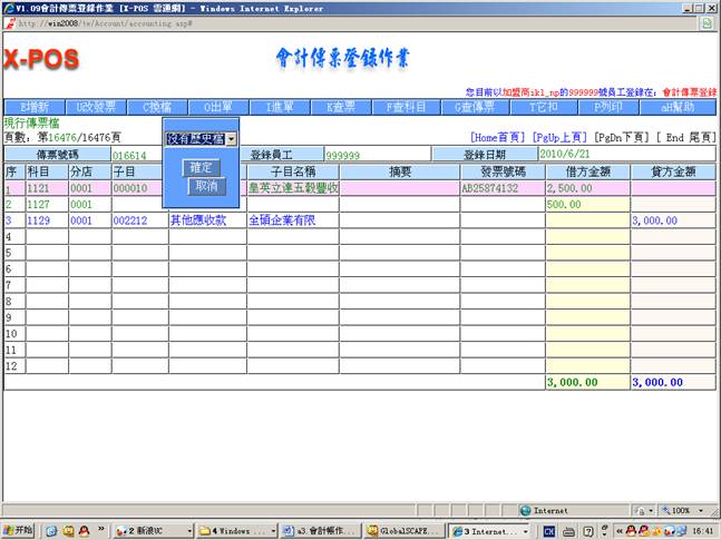 3-7.從現金傳票登錄中增加傳票號碼(016612)