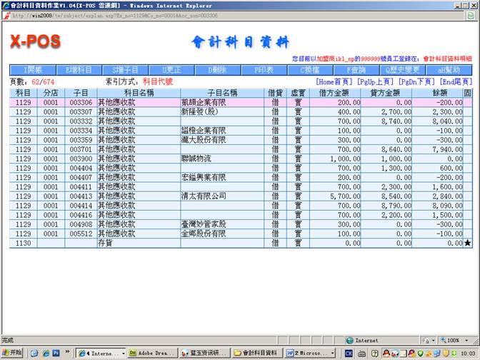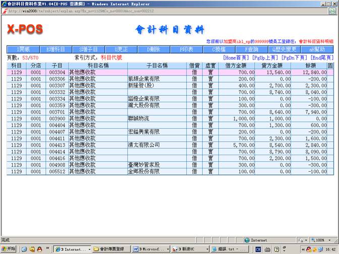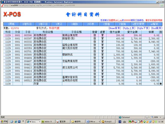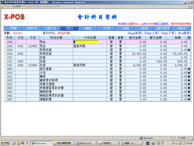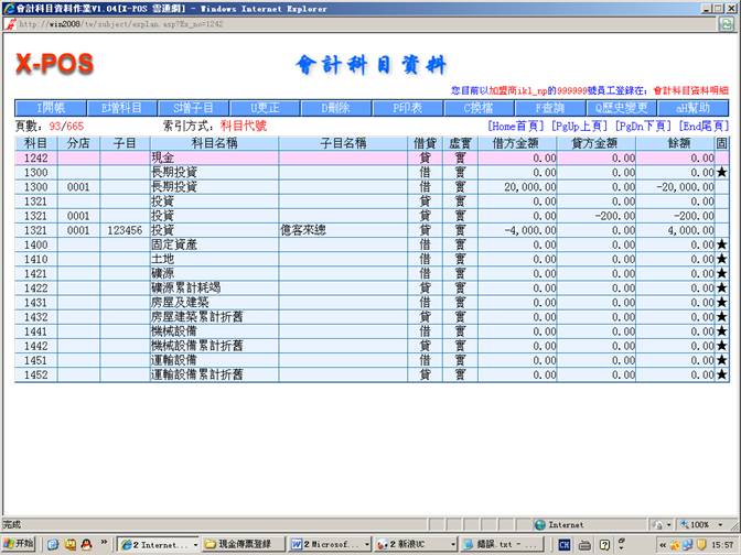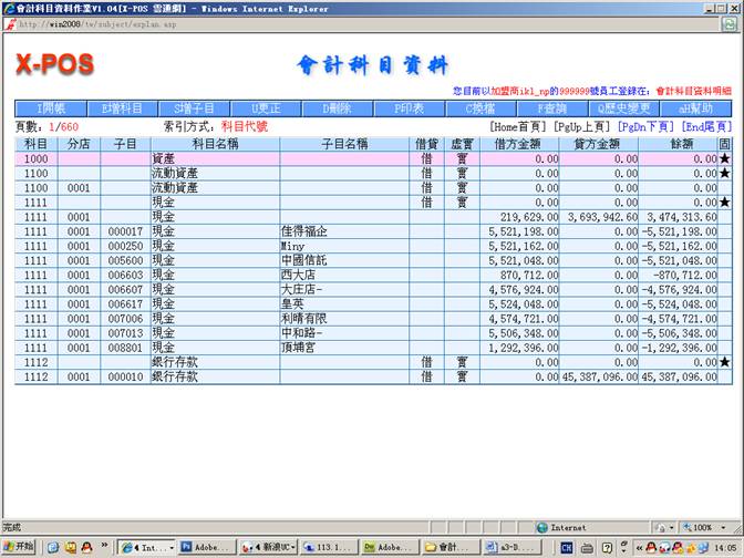 會計科目資料中除了可以自定義各種科目來使用以外,更可以在這個作業中立即查看每個科目的試算餘額,包含子目都可以一覽無遺!本作業中另有提供[開帳]功能,適合第一次使用本系統之用戶,將舊系統之會計試算餘額在這邊輸入後轉入新系統,萬一轉入後發現金金額不正確,允許退出後等重新更正完再次轉入。