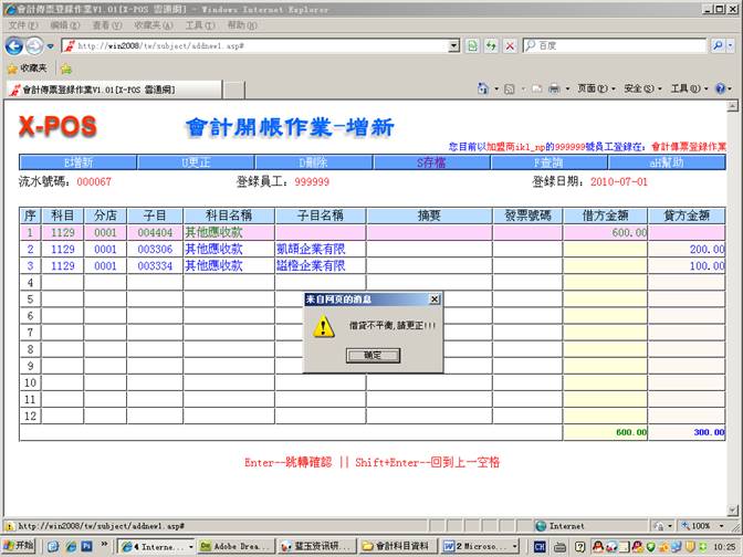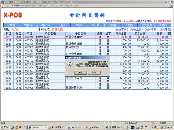 確定刪除這筆記錄,註:保持會計傳票的借貸平衡否則該傳票被視為廢票。例如:將第6頁中的三筆全部刪除。