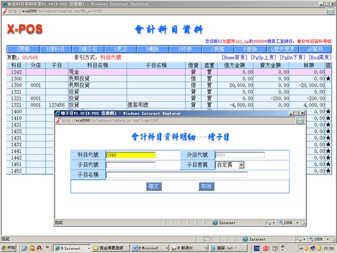5-1. 在會計科目資料明細增子目(子目代號(123456),子目意義(廠商代號),子目名稱(現金投資))=》點擊