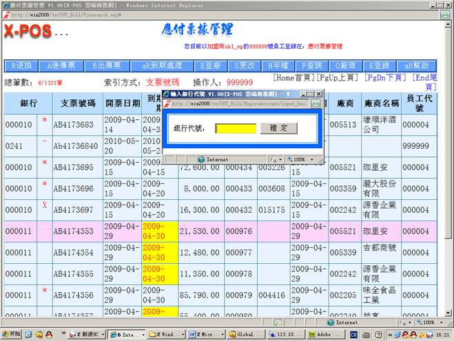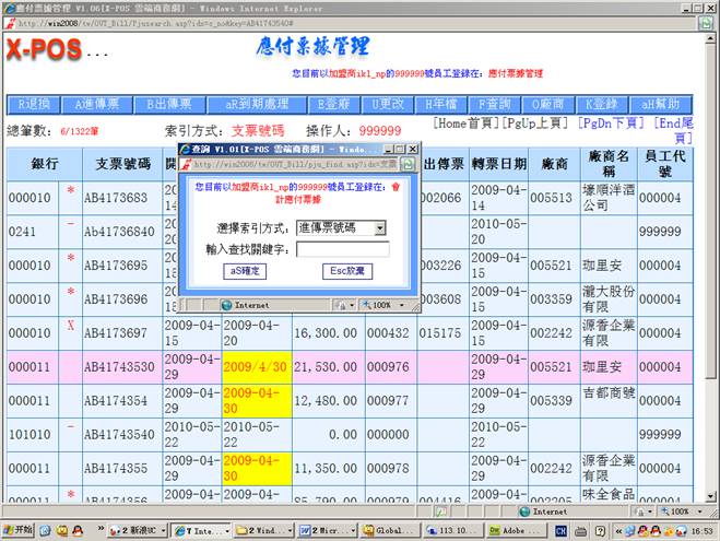 索引方式(進傳票號碼、到期日期、支票號碼、支票金額、開票日期、廠商+到期日期)(此項錯誤)