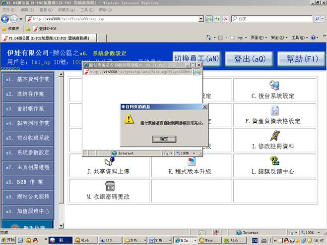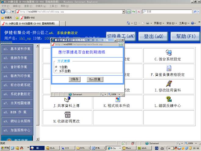 4. 設置應付票據是否自動到期過帳(Y.自動或N.不自動)=》選擇 “Y自動”=》點擊![]()