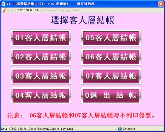 此功能可以對不同的消費群體進行分類結賬,主要目的是分辨商品的消費層次,以便公司內部做相關數據統計。系統已將客人層分7類,在系統中用戶可自由設定分層。