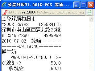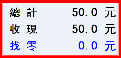 以上對話框顯示本單商品結帳總計金額50元、默認收現50元和找零0元;發票列印中有顯示總計金額50元、收現金50元。此商品(鮮牛奶)系統運用59*1-9.0=50.0計算出此商品折讓9元後的售價。