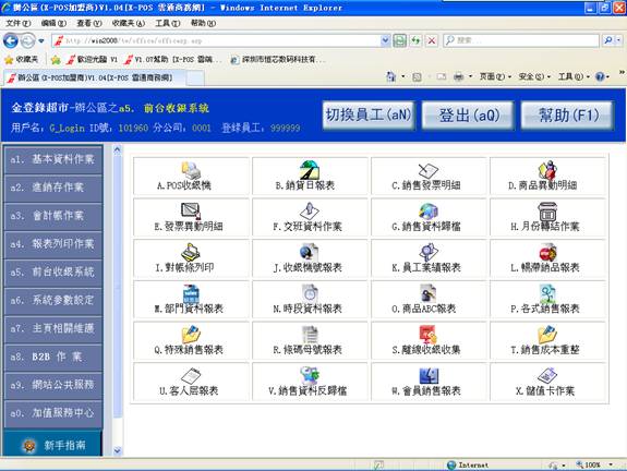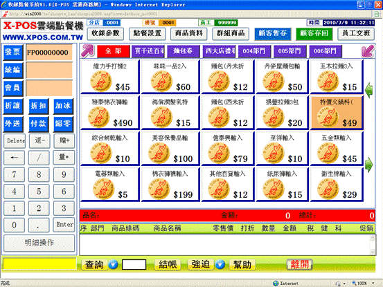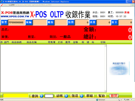 1-9、彈出以下X-POS收銀作業的界面,右上角顯示分店、員工、機號及當前時間信息。