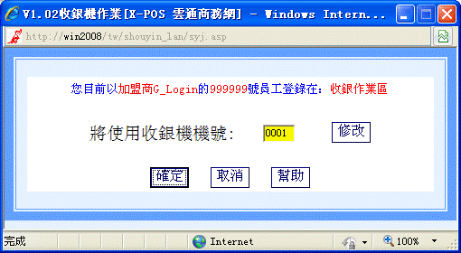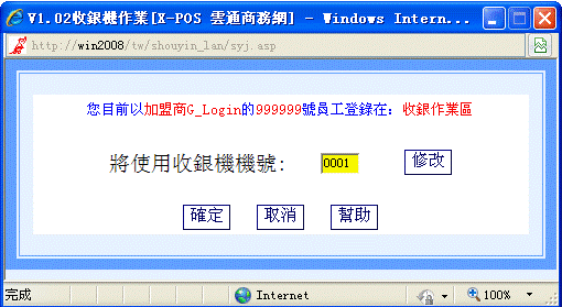 1-8、關閉以上提示後,用戶可在輸入框中輸入正確的收銀機號(如0001),按以上步驟點擊“修改”按鈕並在彈出的輸入框中輸入收銀機號0001。按