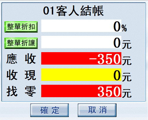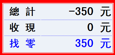 以上對話框顯示總計金額-350元、收現0元和找零350元;發票列印中顯示退350、總計金額0元和找零350元。不良品退貨成功。
