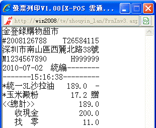 以上對話框中顯示總計金額189.0元(贈品除外)、收現200.0元和找零11.0元;發票列印中顯示:統一3L沙拉油189.0元、玉米澱粉17.2元(贈品)、總計金額:189.0元、收現200.0元和找零11.0元。贈品結帳操作成功!