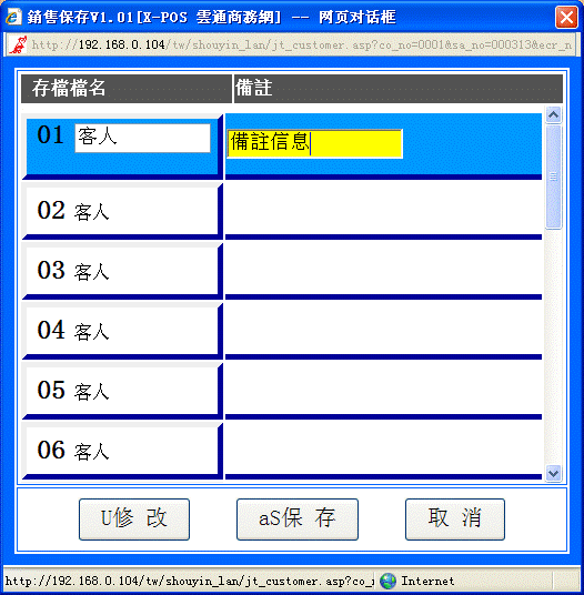 15-4使用暫存恢復的快速建後將彈出以下頁面,裡面顯示已存檔的“01客人”。如存檔條目過多時可使用快捷鍵