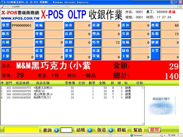 )完成輸入,以下是完成上步操作後的X-POS介面,因此筆結帳是用折讓卡一次性支付,所以可見應收金額已變成0元:![]()