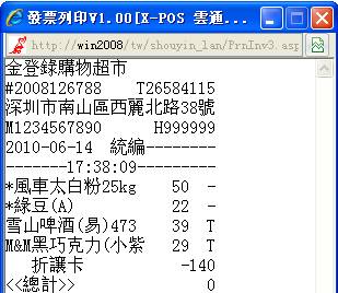 以上對話框所顯示:總計金額0元、收現0元和找零0元;發票列印中顯示:操作員工號999999、折讓卡支付:140元。折讓卡支付成功!