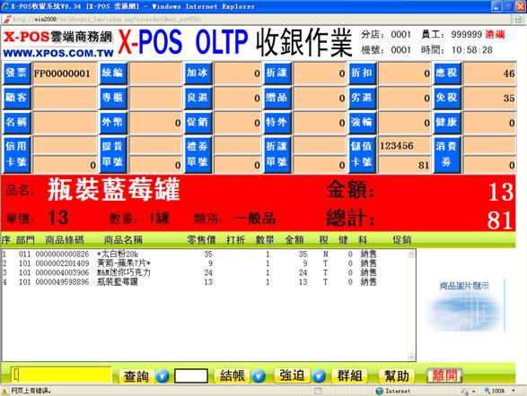 儲值卡也稱預付卡,通常為公司內部發行,就是客戶可以預先將現金金額儲入卡內後再以卡消費,類似銀行卡消費方式,儲值卡區分二種,一種為儲值金額時同時開出等額發票,使用儲值卡消費時該金額將不再開立發票,因此這類的儲值卡內充值之金額不得退款必須使用完畢,另一種為儲值時不開立發票,於消費時依照一般正常開立發票,這種儲值金額通常可以辦理餘額退款还卡作業。例:以X-POS界面中有4筆合計金額為81元的商品等待結帳,顧客出示一張儲值卡慾對此單結帳。