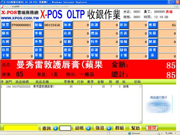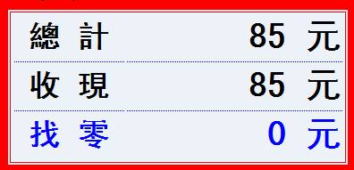以上對話框所顯示:總計金額85元、收現85元;發票顯示:總計金額85元、收現金85元、專柜號123321。使用專櫃結帳操作完成!