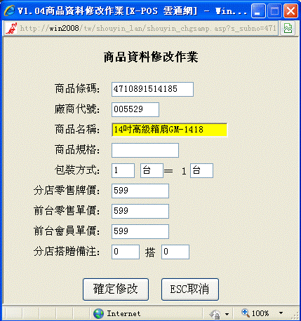 此功能可對商品資料進行修改,如改變商品的名稱、價格、及是否搭贈等。