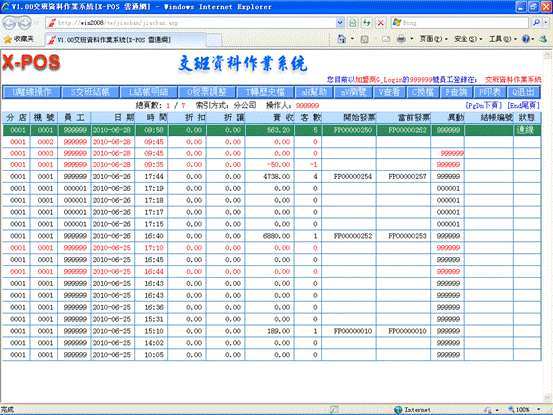 14-3、此時以下交班資料界面中的第一行記錄已為變紅顏色(如在X-POS收銀界面中正常離開,交班記錄將是正常顏色),並且已不再顯示“連線”。