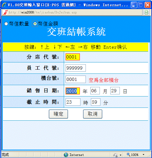 結帳為例,在輸入框裡輸入需要結帳的分店代號、員工代號、機臺號、銷售日期以及截止時間(其分店代號、銷售日期和截止時間為默認當前收銀機所使用資訊),並按
