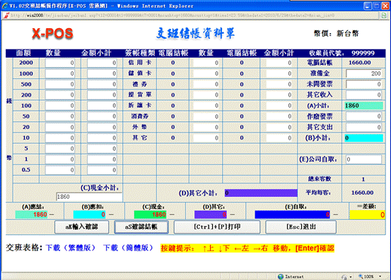 處輸入實收金額即可。如實收1860元(無短款)。輸入後點擊