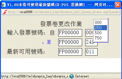 當收銀機發票卷用完,用此功能可以設定發票卷自動往一個新的號碼開始,例如尾數號碼為000-249之間的發票卷號碼用完後,你可以重新設定換卷從249-499號碼開始,或也可以強制更改使用其它的發票卷號碼。系統預設的發票卷是每一千號分四卷,有000~249,250~499,500~749,750~999。