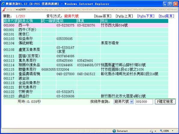,您將進入查詢頁面。在查詢頁面中,您可以先看當前頁中,是否有您所需的採購的廠商代號,若有單擊它即可;若無,您可以利用鍵盤上的